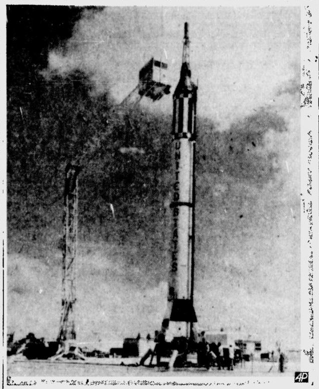 Это «Меркурий-Редстоун-4» на пусковой площадке мыса Канаверал, штат Флорида. Ракета, с уже установленной космической капсулой, в пятницу понесет капитана Вирджила А. Гриссома в суборбитальный полет.
