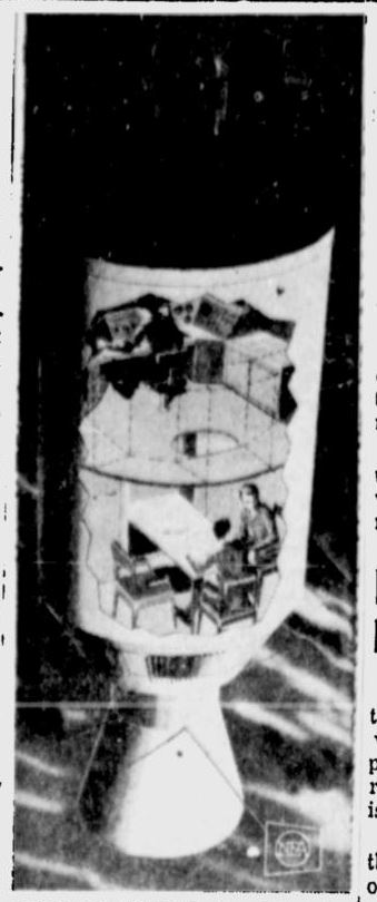 Исследовательская космическая станция «МАРС» с экипажем из трех человек показана на высоте 200 миль над Землей. В отсеке наверху расположен комплект приборов. Внизу - жилые и обеденные помещения. Третий отсек внизу - это отделяемая космическая капсула, в которой экипаж будет лететь во время запуска и при возвращении. Идея станции «МАРС» изучается компанией «Дженерал Дайнамикс/Астронаутикс» в Сан-Диего.