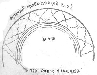 Наши радио-волны не могут покинуть земной шар и уйти в межпланетное пространство, так как, достигнув верхнего проводящего слоя, они отразятся от него обратно к земной поверхности. Это обстоятельство для земных радио-сообщений очень выгодно, так как не дает энергии радио-воли рассеиваться, но, с другой стороны, не позволяет радиоволнам другой какой-нибудь планеты, например, Марса, проникнуть на землю. Ни волны наших станций, ни марсианских, если таковые там есть, не сумеют пройти через этот слой. Рисунок и схема поясняют сказанное.