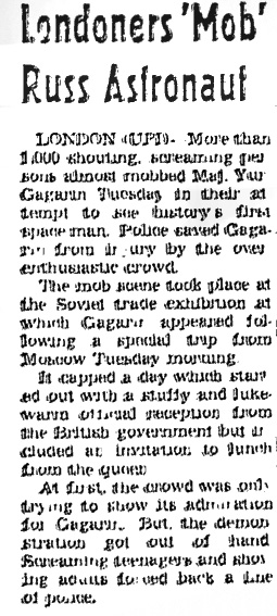 Гагарин, до конца вызывавший столпотворения, оказался осажден бушующей и кричащей толпой из 2’000 человек, когда вышел из советского посольства, чтобы ехать в аэропорт. Это была типичная сцена с тех пор, как он в прошлый вторник вышел из самолета, начав свой первый визит в Западную Европу.