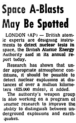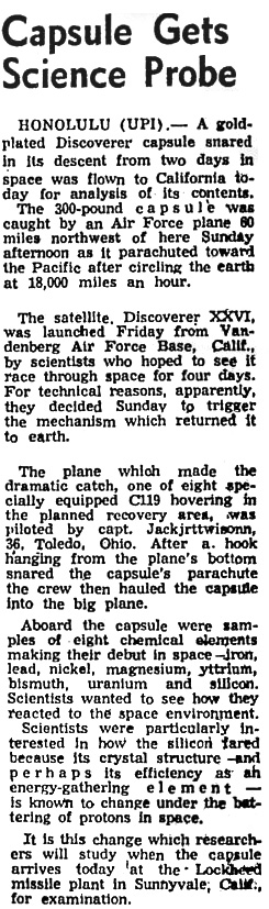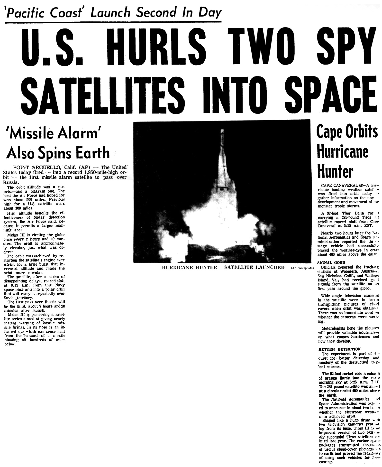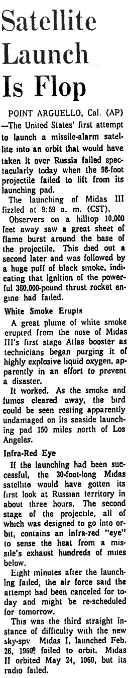 Пойнт-Аргуэлло. ВВС отменили в воскресенье попытку запуска шпионского спутника «Мидас-3» после того, как обратный отсчет дошел до нуля. Отмена никак не объясняется и дата нового запуска не объявлена.