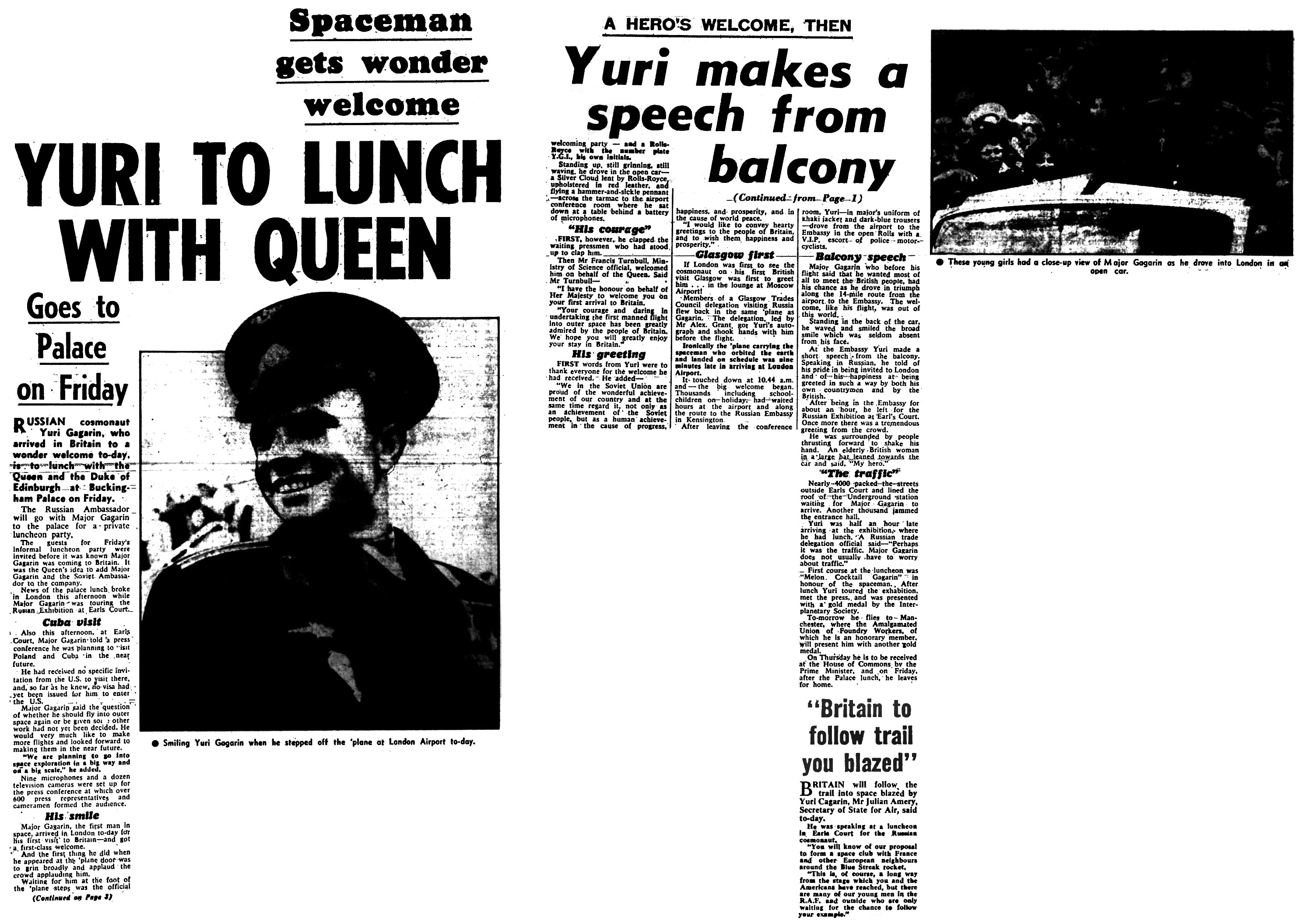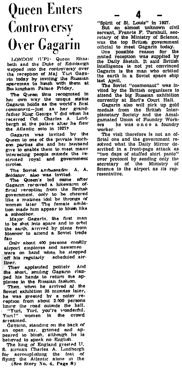 Комментируя появление космонавта во дворце – едва-ли подходящем месте для марксиста – московское радио сказало: «В соответствии с британской традицией, прием иностранного гостя правящим монархом является высочайшей почестью».
