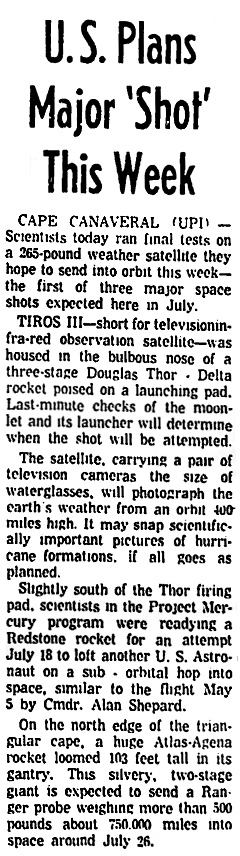 - *Спутник «Тирос» передает вторую фотографию шторма (сайт не открывается) (на англ.) «Schenectady Gazette», 15.07.1961