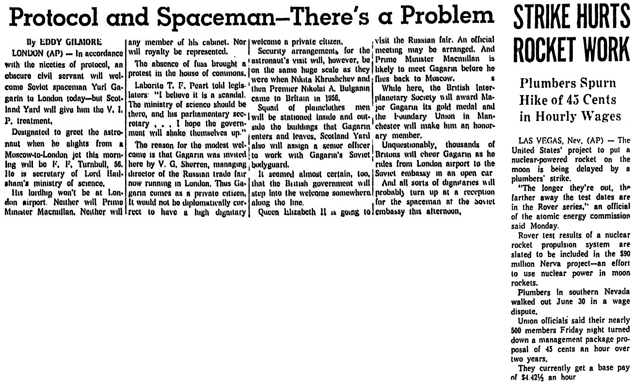 Майор Гагарин, измотанный путешествиями и рукопожатиями, долго спал этим утром, прежде чем отправиться в Букингемский дворец, где его имя было добавлено в список гостей, после того, как он прибыл в Лондон.