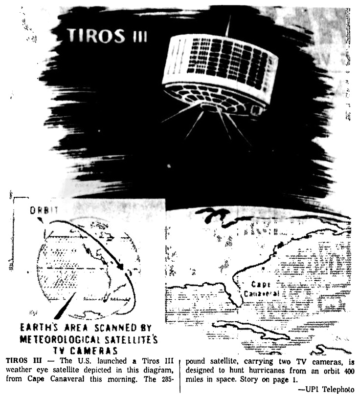 Погодное бюро сообщило, что многие из более 20’000 фотографий Земли, сделанных с «Тироса-1», первого экспериментального метеоспутника, могут быть заказаны у Национального центра метеозаписей, Эшвилль, штат Северная Каролина. Снимки доступны в 100-футовых катушках, по $4 за катушку.