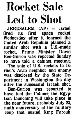 - *1-я ракета, запущенная Израилем (1st Rocket Sent Aloft by Israeli) (на англ.) «Spokane Daily Chronicle», 5.07.1961 в jpg - 207 кб