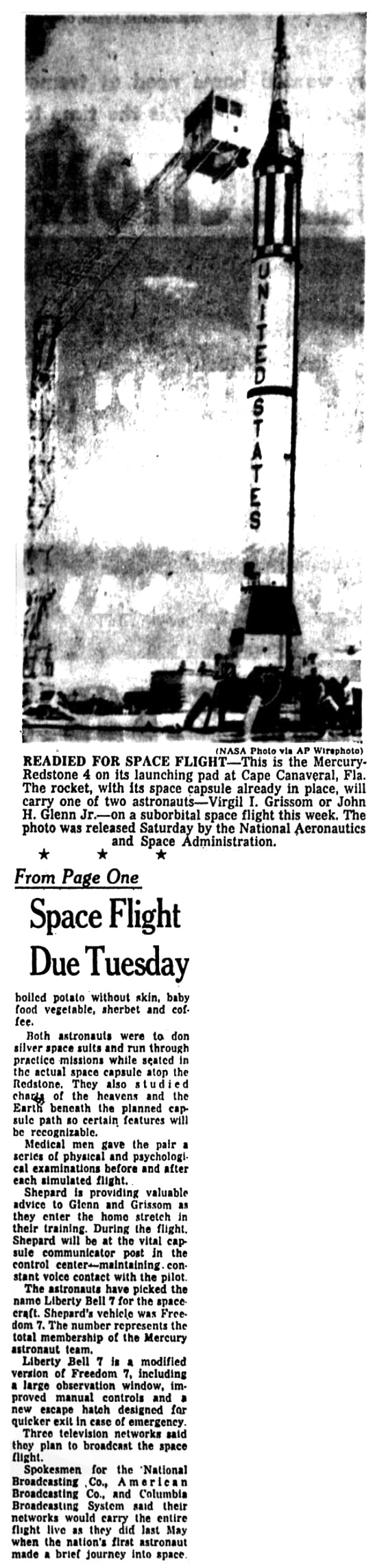 Машинерия готова. Информированный источник сказал, что семь миль проводов и мириад электронных элементов на борту колоколообразной капсулы «Либерти Белл-7» «прекрасно выверены». Финальные испытания 83-футовой связки ракеты, капсулы и башни аварийного спасения пройдут в понедельник и вторник.