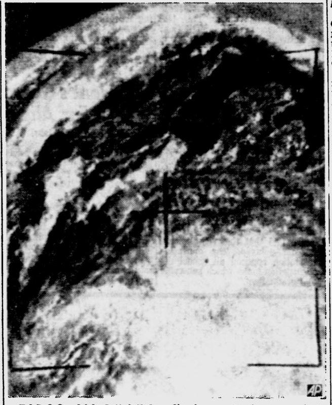 Скопления облаков над Аппалачами, принесшие дожди и грозы, показаны внизу справа на этом снимке, сделанном спутником метеонаблюдения «Тирос-3». Наверху справа отчетливо виден полуостров Мичиган.