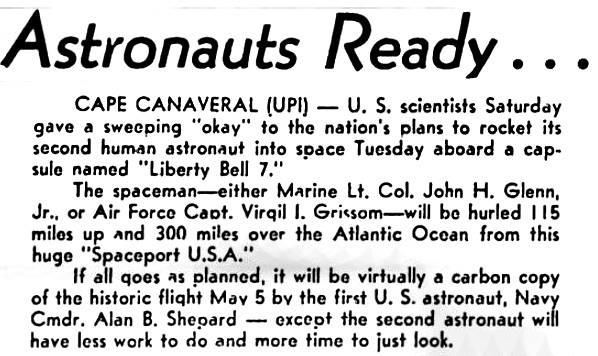 Надежные источники говорят, что Гриссом является выбором №1 для второго пилотируемого космического полета Америки, а Гленн будет наготове, если медицинский осмотр или что-нибудь иное устранит Гриссома в финальные часы.
