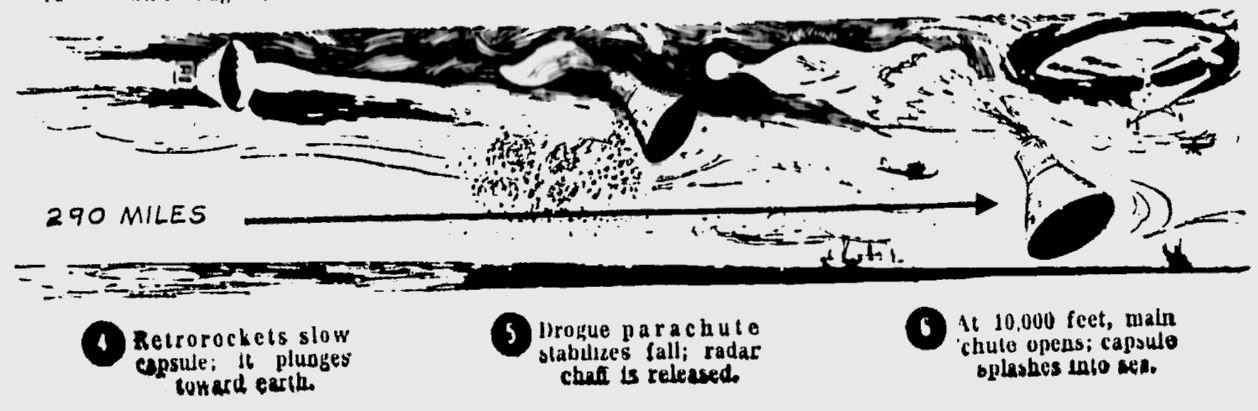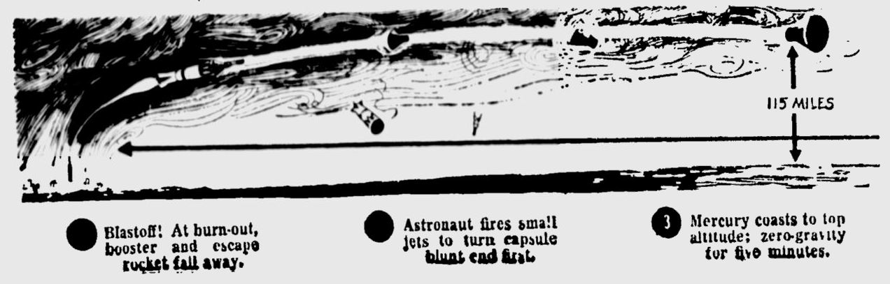 Космонавт – либо подполковник морской пехоты Джон Г. Гленн-младший, или капитан ВВС Вирджил А. Гриссом – будет из этого огромного «космопорта США» запущен на 115 миль вверх и на расстояние в 300 миль над Атлантическим океаном.