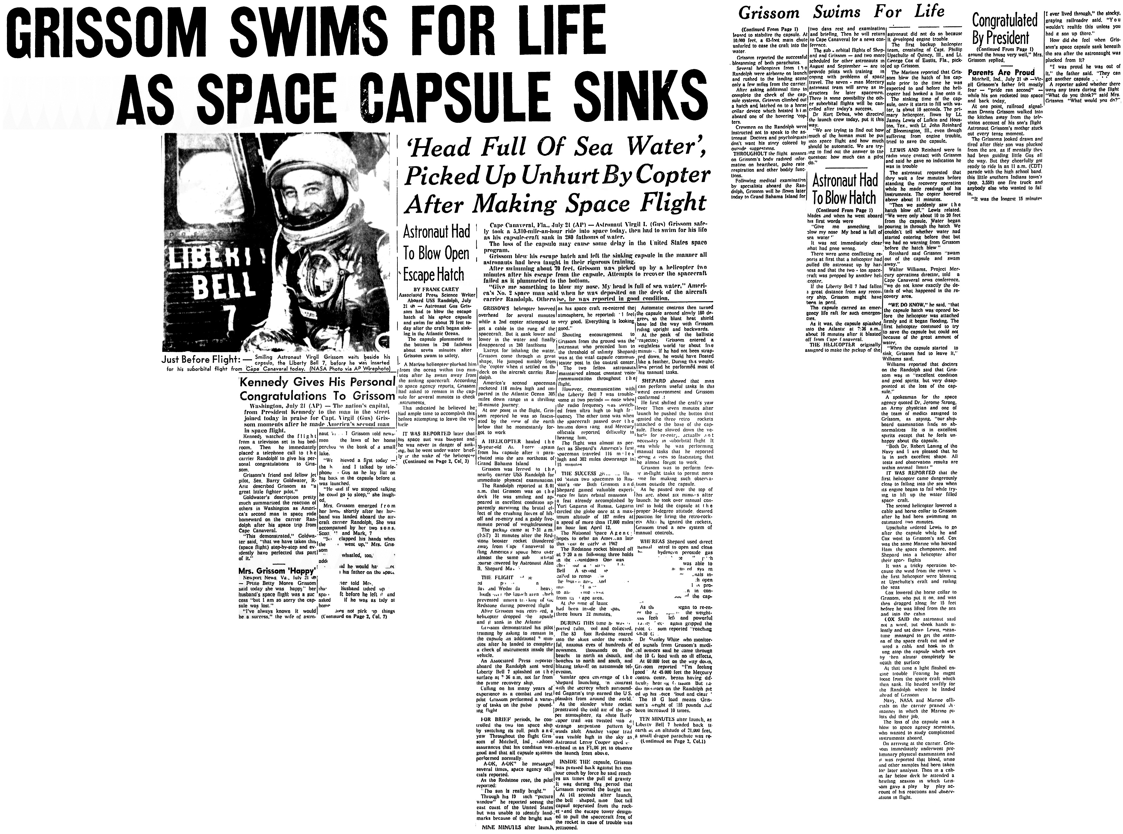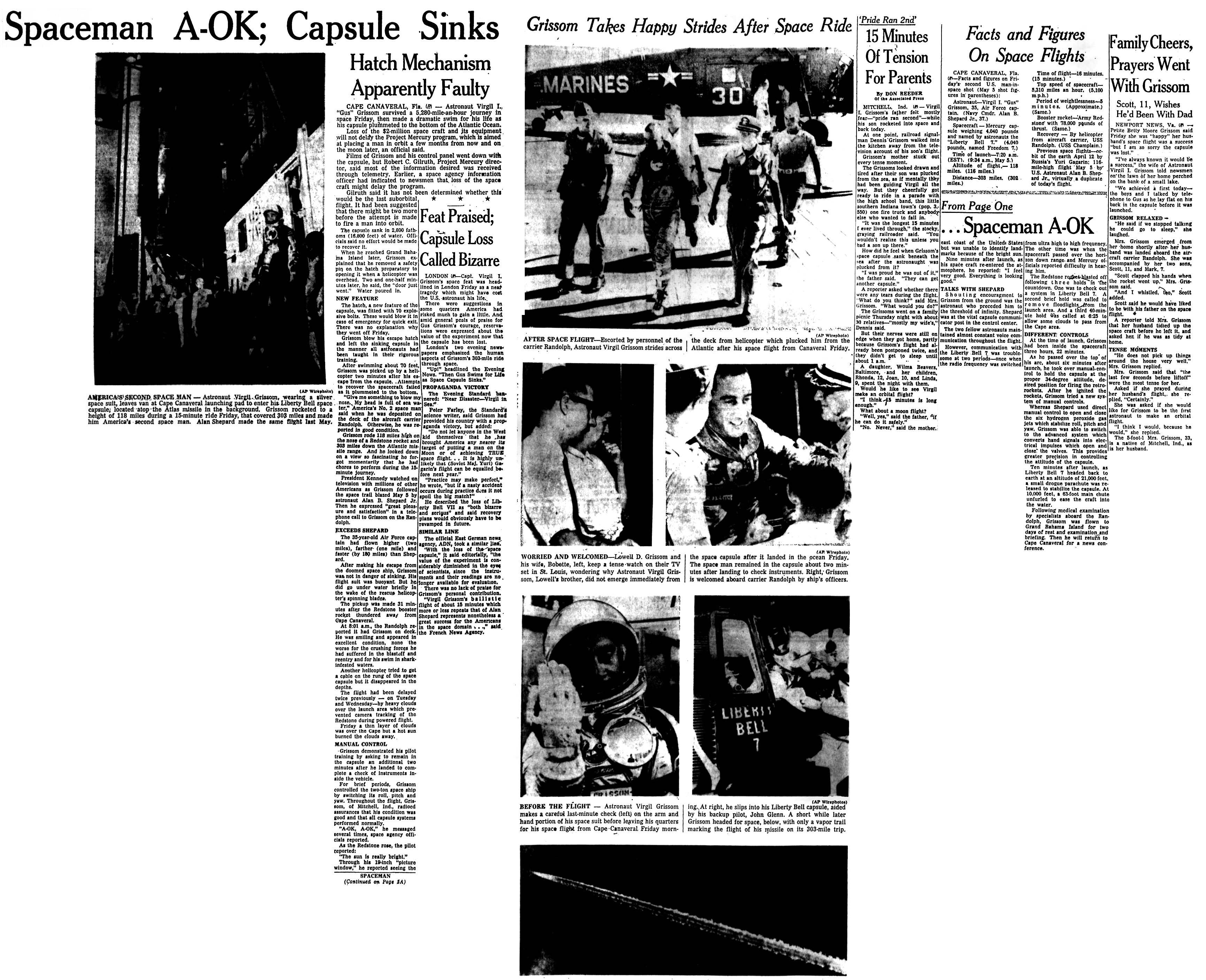 Этим утром США отправили своего второго астронавта в суборбитальный полет над атлантическим ракетным полигоном. 35-летний капитан Вирджил Гриссом из Митчелла, штат Индиана, полетел в «Либерти Белл-7», капсуле проекта «Меркурий» на 118 миль вверх и на расстояние в 305 миль от мыса Канаверал, штат Флорида. Авианосец «Рэндольф» и флотилия меньших судов ждали, чтобы спасти капсулу и астронавта после их возвращения от границы космоса.