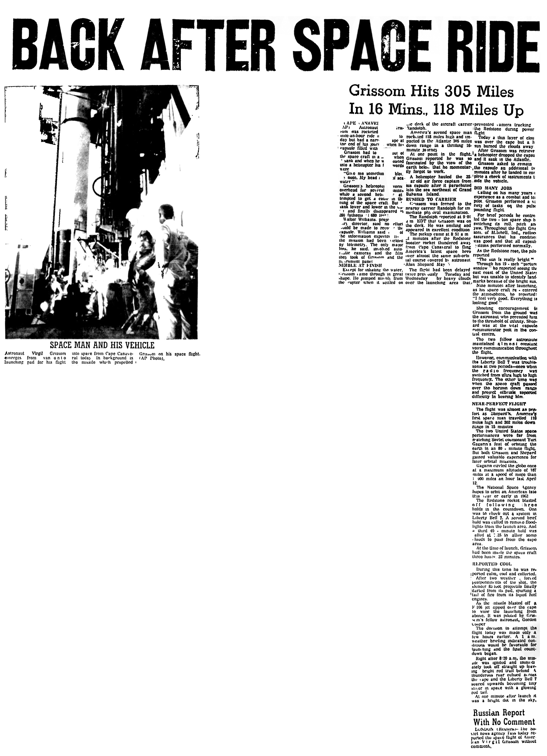 Если капитан ВВС Вирджил А. Гриссом наконец совершит сегодня свой космический полет, то «Ивнин Ньюз» опубликует сегодня утром «Специальный космический выпуск». В нем будут все подробности и фотографии этого достижения с мыса Канаверал.
