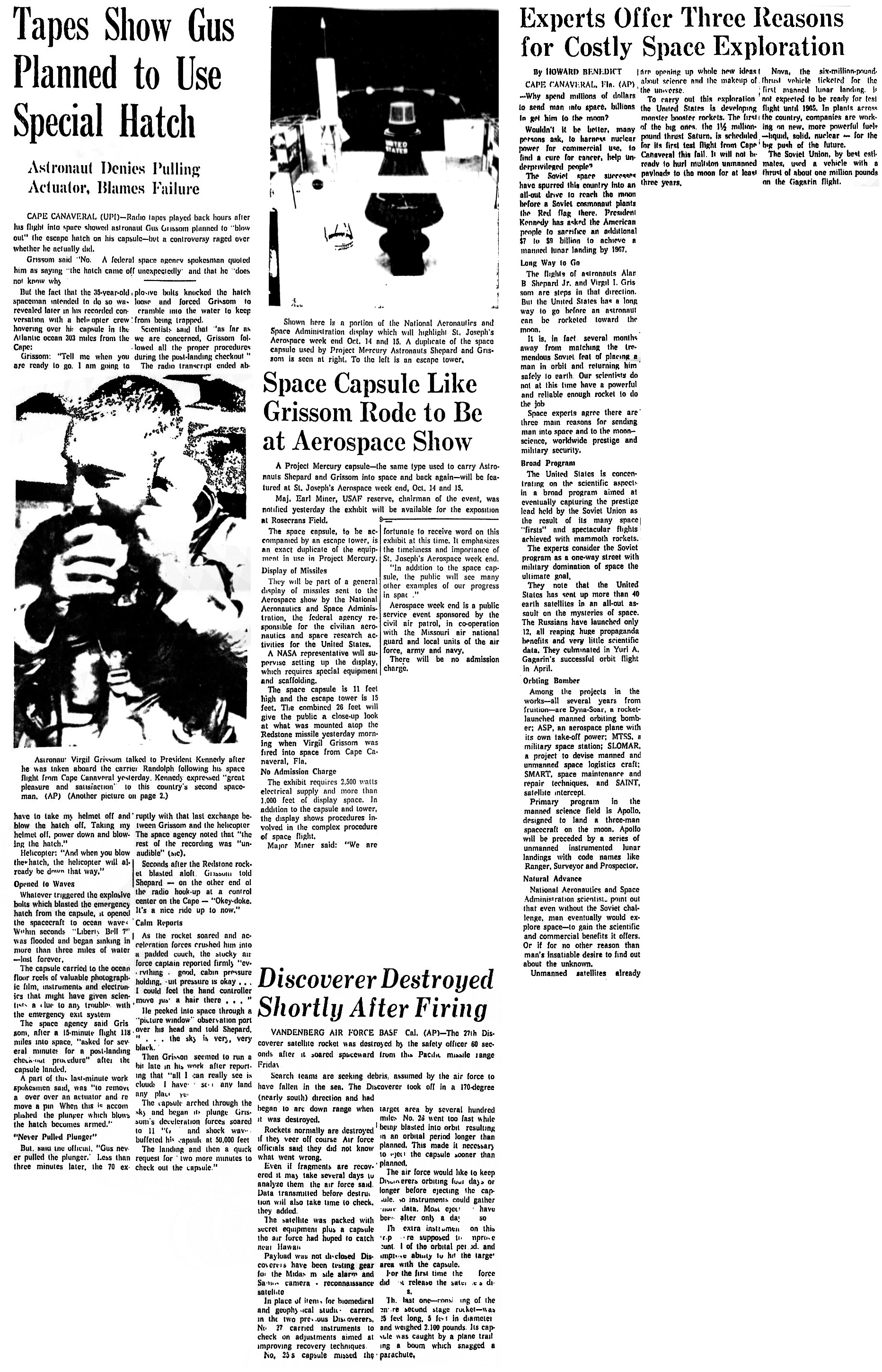 — *Записи показывают, что Гас планировал использовать специальный люк (Tapes Show Gus Planned to Use Special Hatch) (на англ.) «St. Joseph News-Press», 22.07.1961 в jpg — 1,52 Мб