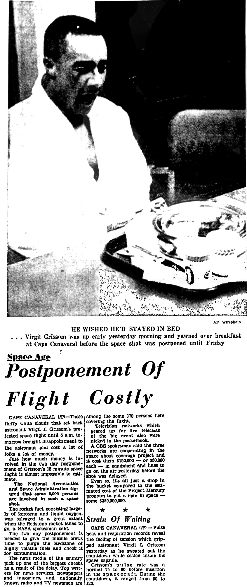 Гриссом должен провести день отдыхая в уединении и продолжая подготовку к своему полету, предназначенному дать дополнительную информацию к совершенному 5 мая полету коммандера Алана Шепарда.