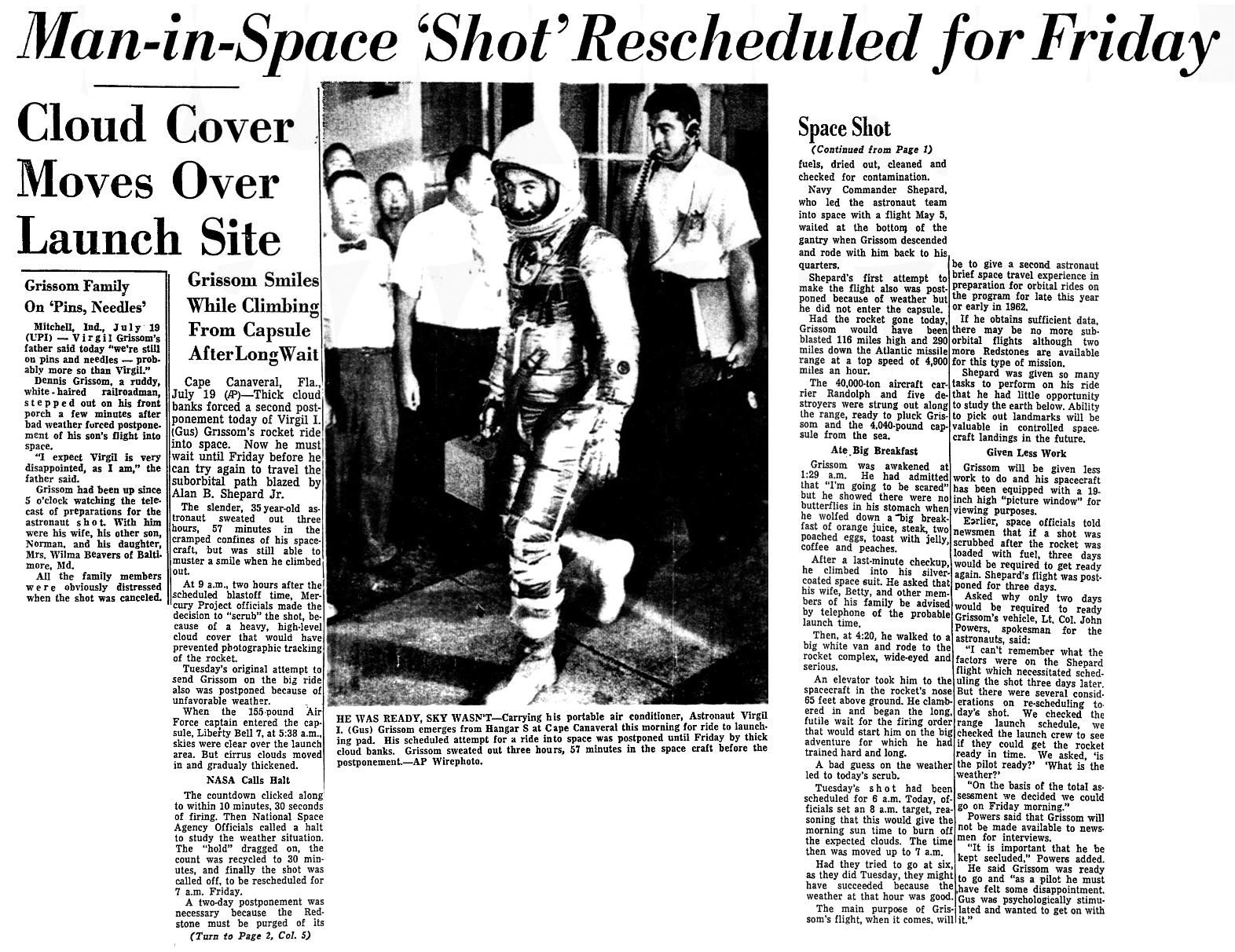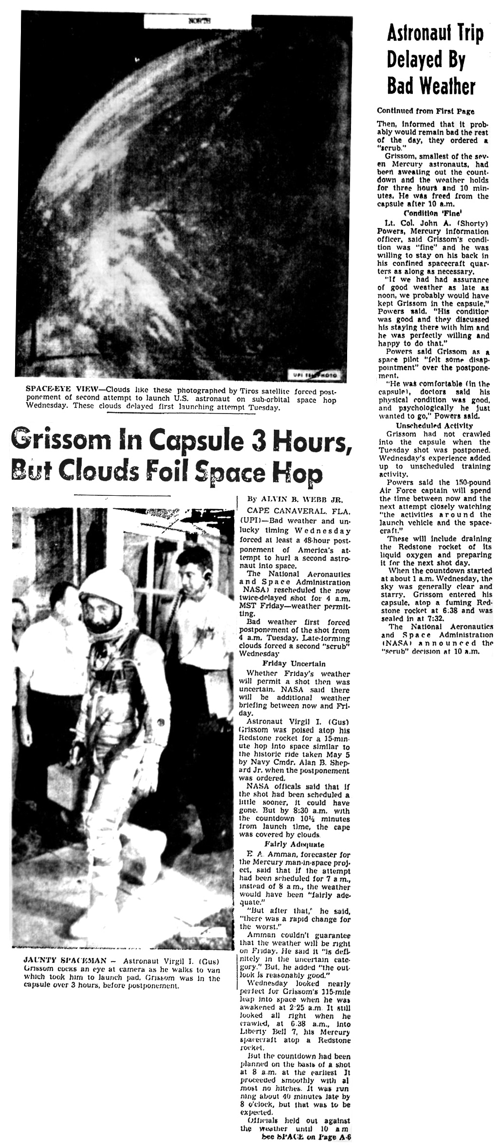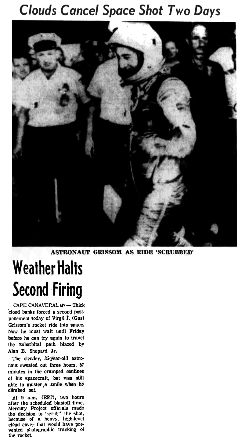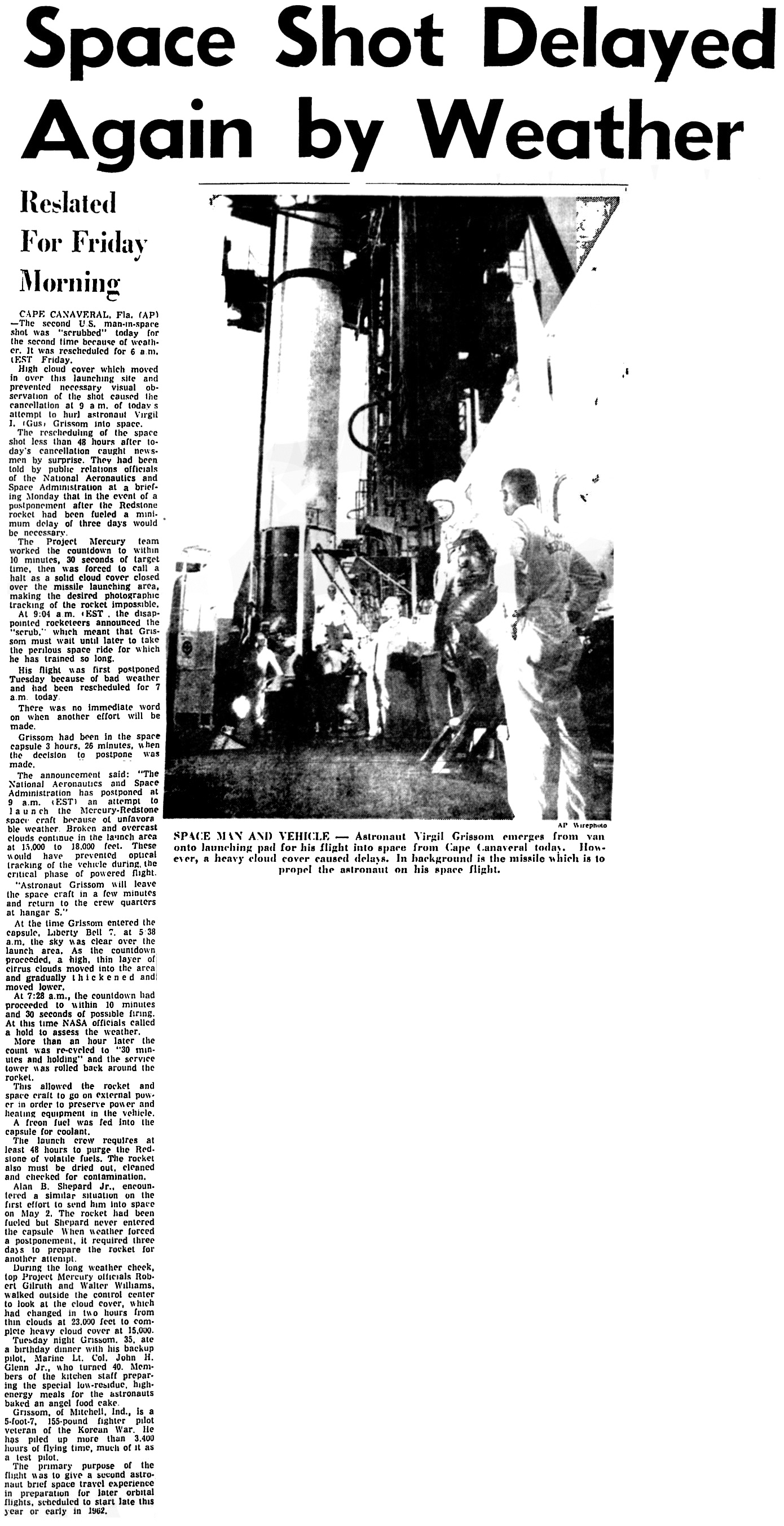Элтон Блэкисл. Мыс Канаверал. В третий раз астронавт Вирджил (Гас) Гриссом и 5'000 оказывающих ему прямую поддержку человек, поставили сегодня на то, что капризная погода позволит в пятницу совершить полет в космос.