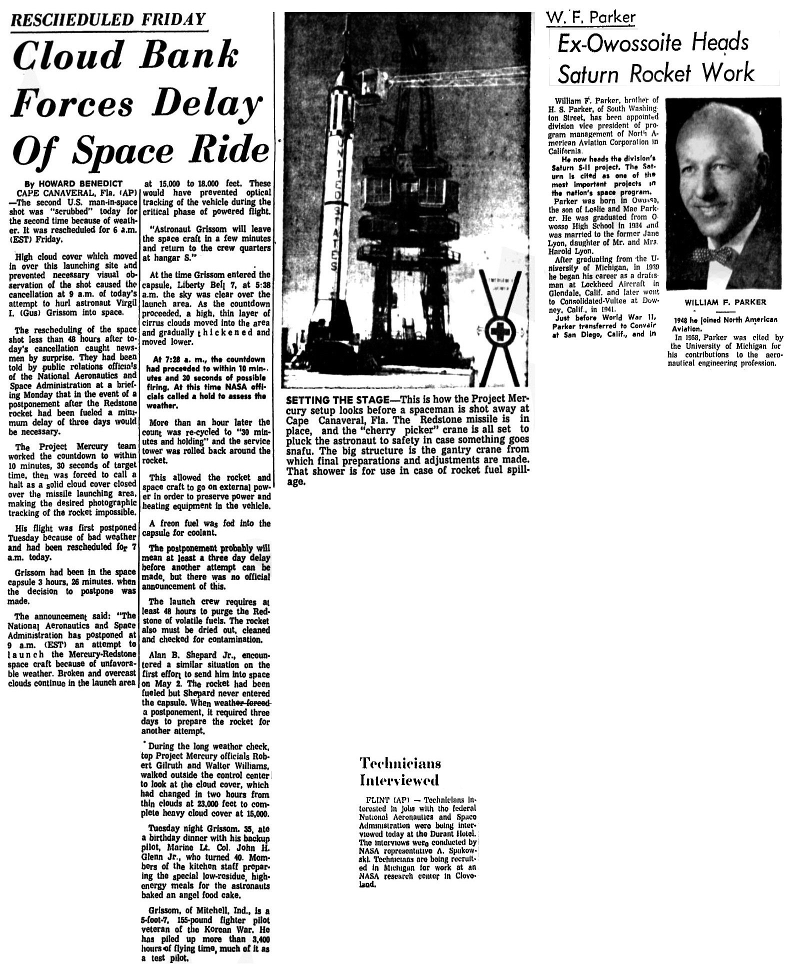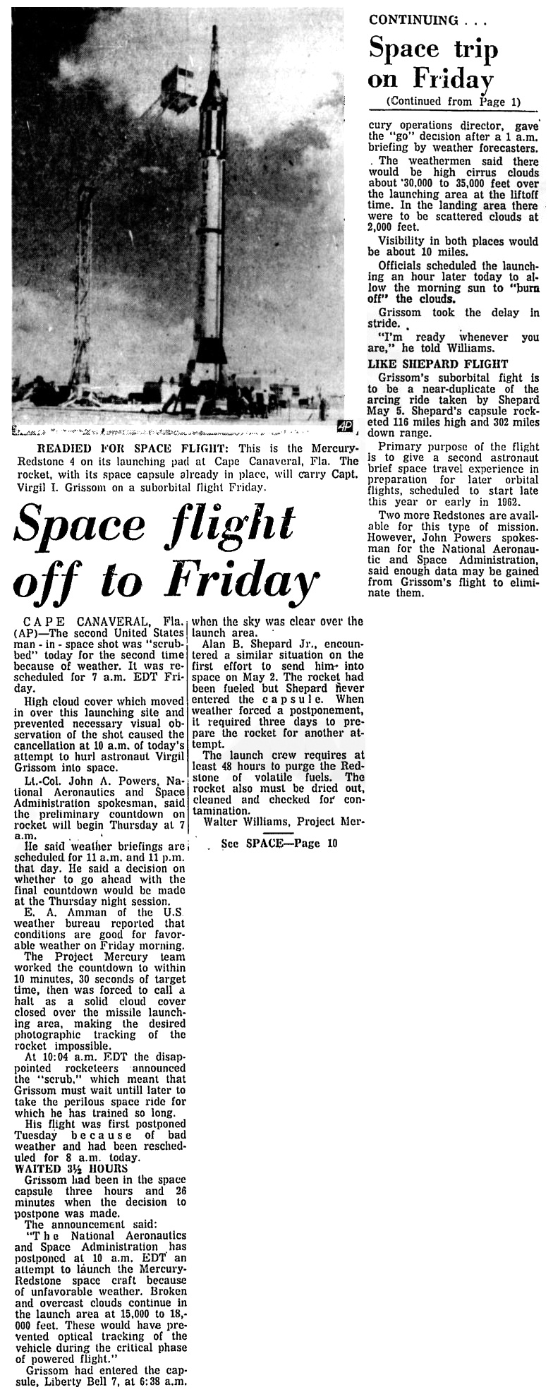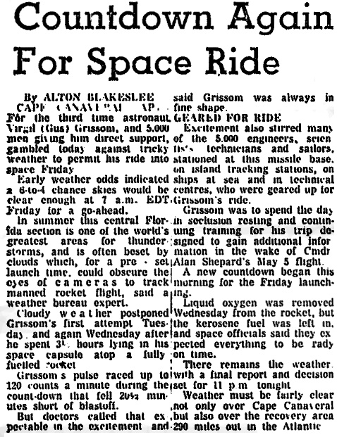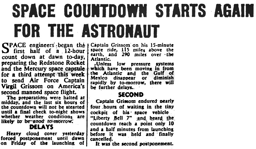 Космические инженеры сегодня на рассвете начали первую половину 12-часового обратного отсчета, готовя ракету «Редстоун» и космическую капсулу «Меркурий» к третьей попытке отправить капитана ВВС Вирджила Гриссома во второй пилотируемый космический полет Америки.