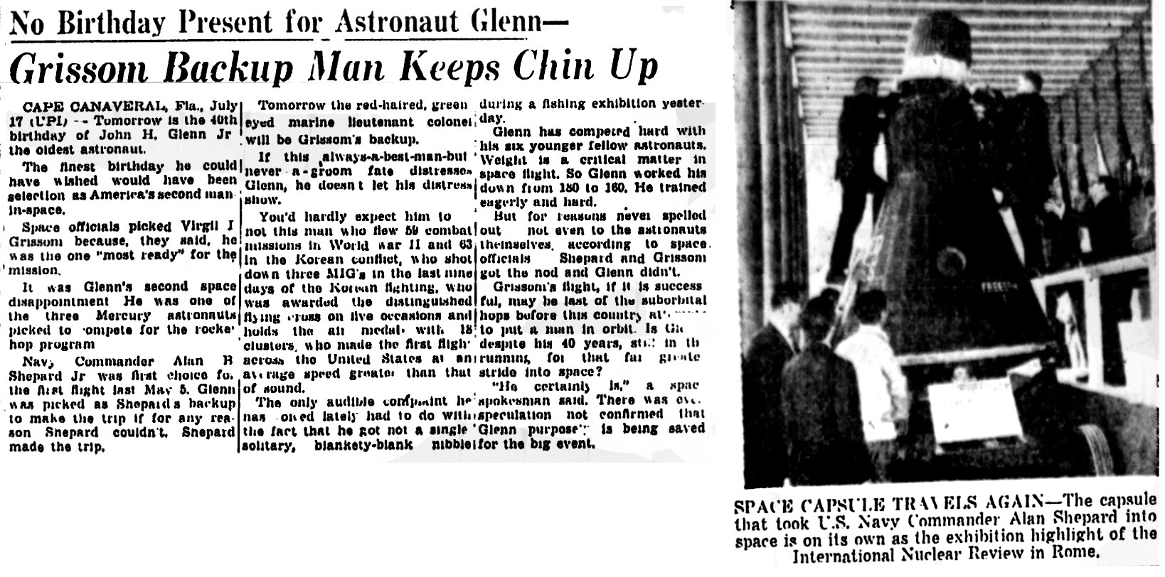 Как и в первом майском полете, подполковник морской пехоты Джон Х. Гленн из Кембриджа, штат Огайо, по-видимому выбран «запасным пилотом», готовым шагнуть вперед и совершить полет, если возникнут какие-либо перестановки в плане.