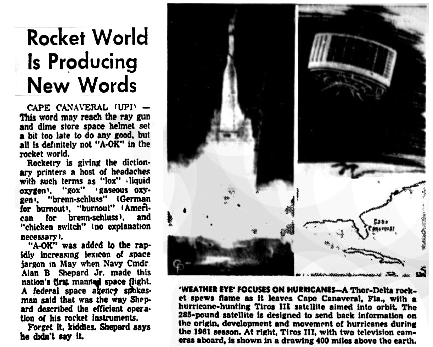 «А-ОК» было добавлено в стремительно растущий космический жаргон в мае, когда коммандер ВМС Алан Б. Шепард-младший совершил первый пилотируемый космический полет страны. Представитель федерального космического агентства сказал, что таким образом Шепард описал эффективную работу его ракетных приборов.