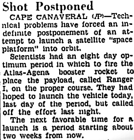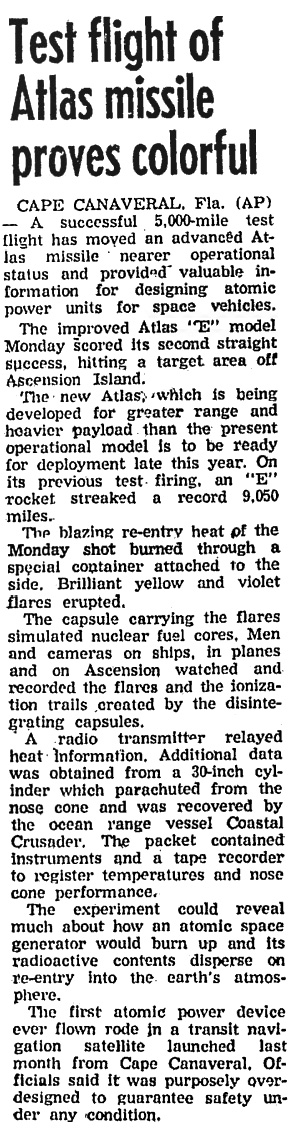 Мыс Канаверал, штат Флорида. Успешный испытательный полет на 5'000 миль улучшенной ракеты «Атлас» приблизил срок ее готовности и предоставил ценную информацию для разработки атомных источников питания для космических аппаратов.