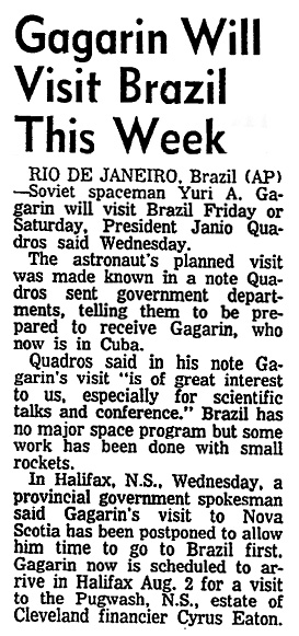 — *Новая Шотландия готовится развлекать Гагарина (Nova Scotia Prepares To Entertain Gagarin) (на англ.) «Quebec Chronicle-Telegraph», 25.07.1961 в jpg — 215 кб