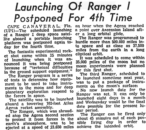 — *Запуск «Рейнджера-1» отложен в четвертый раз (Launching Of Ranger I Postponed For 4th Time) (на англ.) «Prescott Evening Courier», 1.08.1961 в jpg - 133 кб