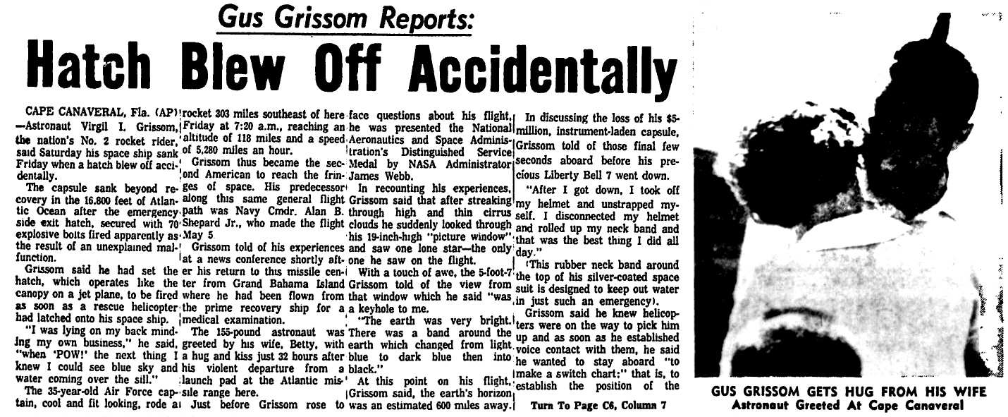 Мыс Канаверал. Радиозаписи, прослушанные через несколько часов после полета в космос, показали, что астронавт Гас Гриссом планировал «отстрелить» спасательный люк своей капсулы, но споры разгорелись о том, действительно ли он так сделал.