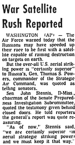 Вашингтон. Вашингтон. ВВС предупредили сегодня, что Советы могли ускорить свою программу, нацеленную на то, чтобы стать первыми со спутником, способным обрушить уничтожение на наземные цели.