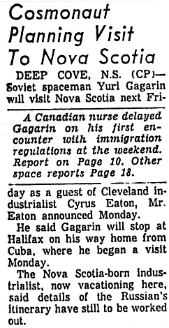 Дип-Ков, Новая Шотландия. Советский космонавт Юрий Гагарин в следующую пятницу посетит Новую Шотландию, как гость кливлендского промышленника Сайруса Итона. Об этом в понедельник объявил мистер Итон.