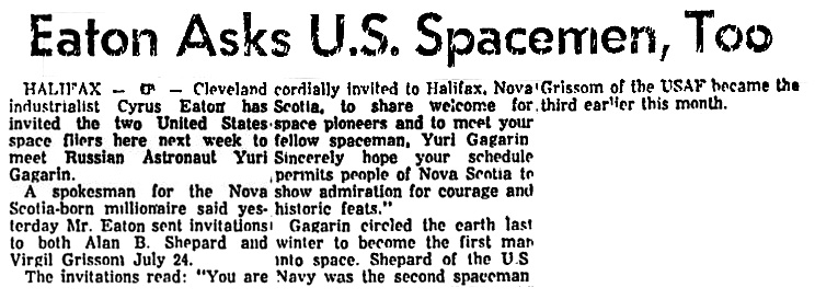 Сайрус Итон, промышленник из Кливленда, отдыхающий на своей ферме на южном побережье, объявил в понедельник, что первый человек, побывавший в космосе и принявший его приглашение посетить эту провинцию, приедет в пятницу.