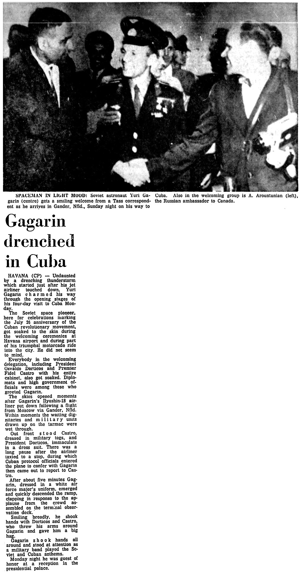 Гандер, Ньюфаундленд. Советский космонавт майор Юрий Гагарин, совершая свой первый визит в «Новый мир», сегодня улетит на Кубу, где его встретят с красным ковром — церемония, обычно приберегаемая для глав государств.