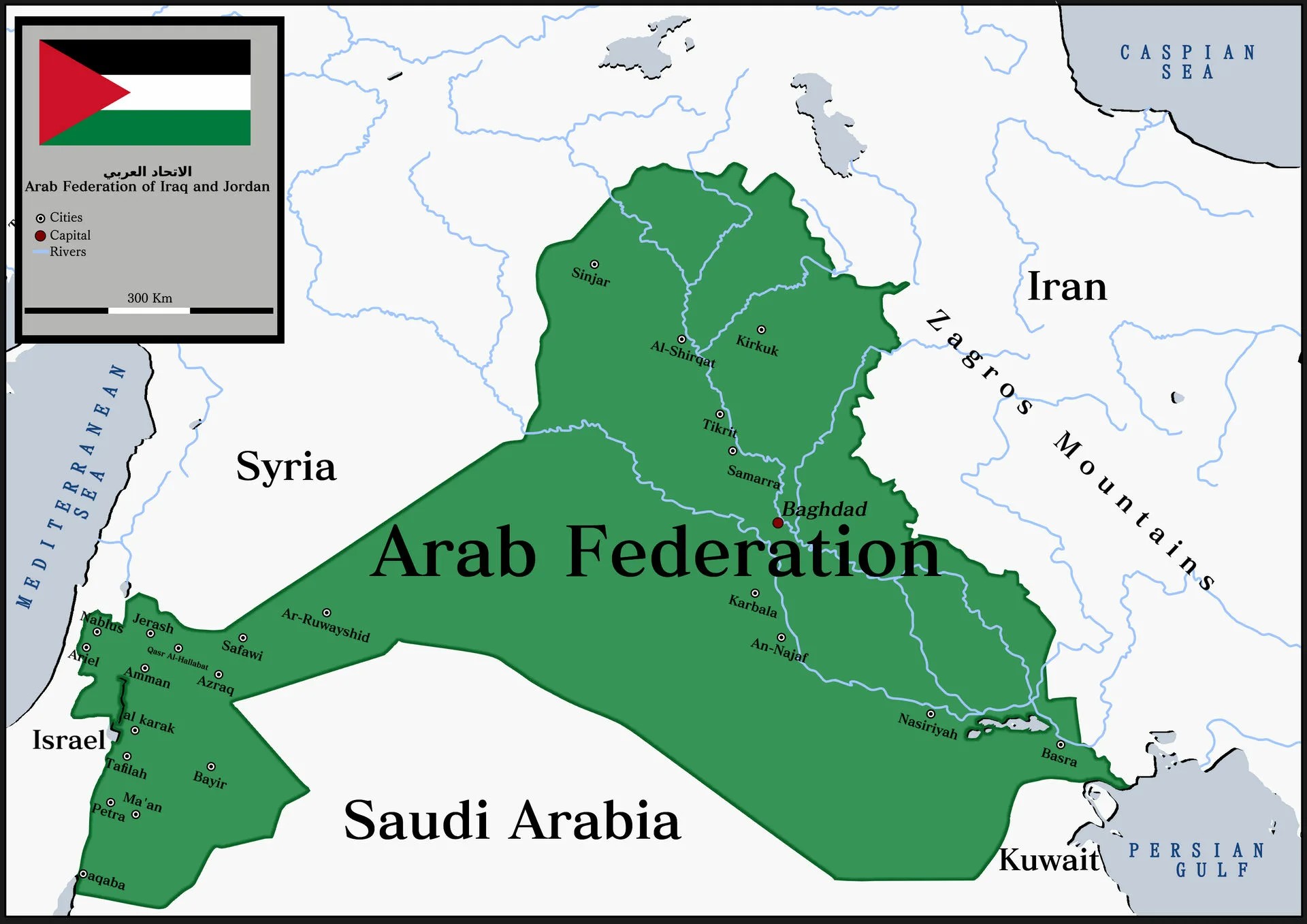 14 февраля 1958 года - Арабская Федерация. Король Ирака Фейсал II и его двоюродный брат, король Иордании Хусейн, попытались объединить свои два хашимитских королевства в ответ на образование Объединенной Арабской Республики между Египтом и Сирией. Союз просуществовал всего шесть месяцев.