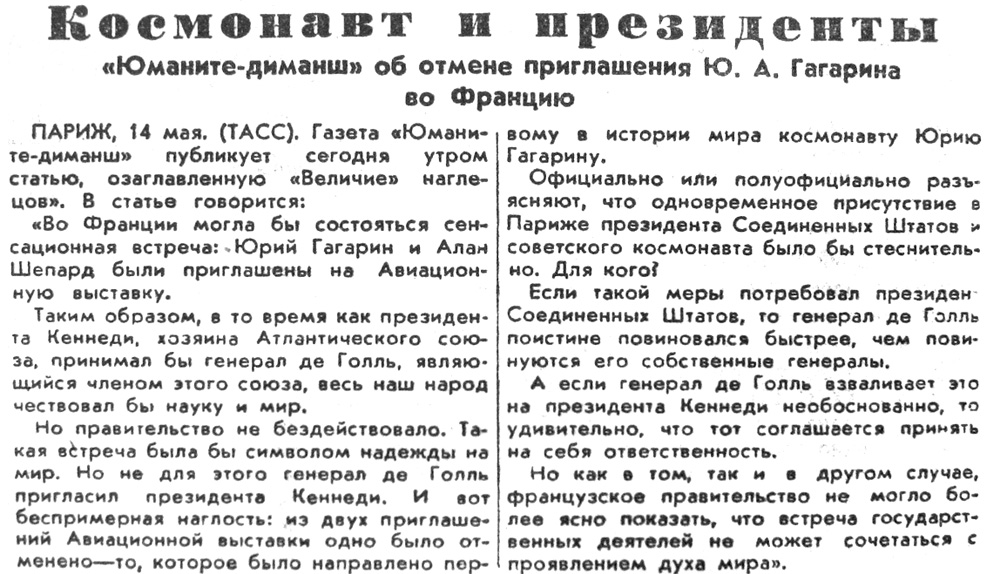 "Юманите" напечатала статью «"Величие" наглецов», заклеймив правительство Франции за нежелание встречи Гагарина и Шепарда в Париже одновременно со встречей Кеннеди и Де Голля