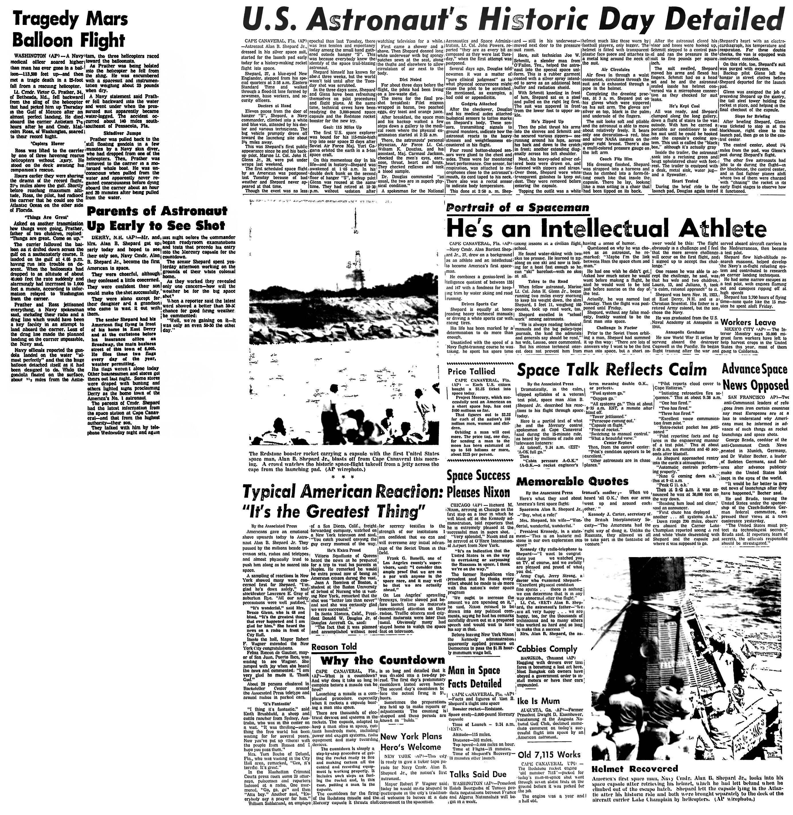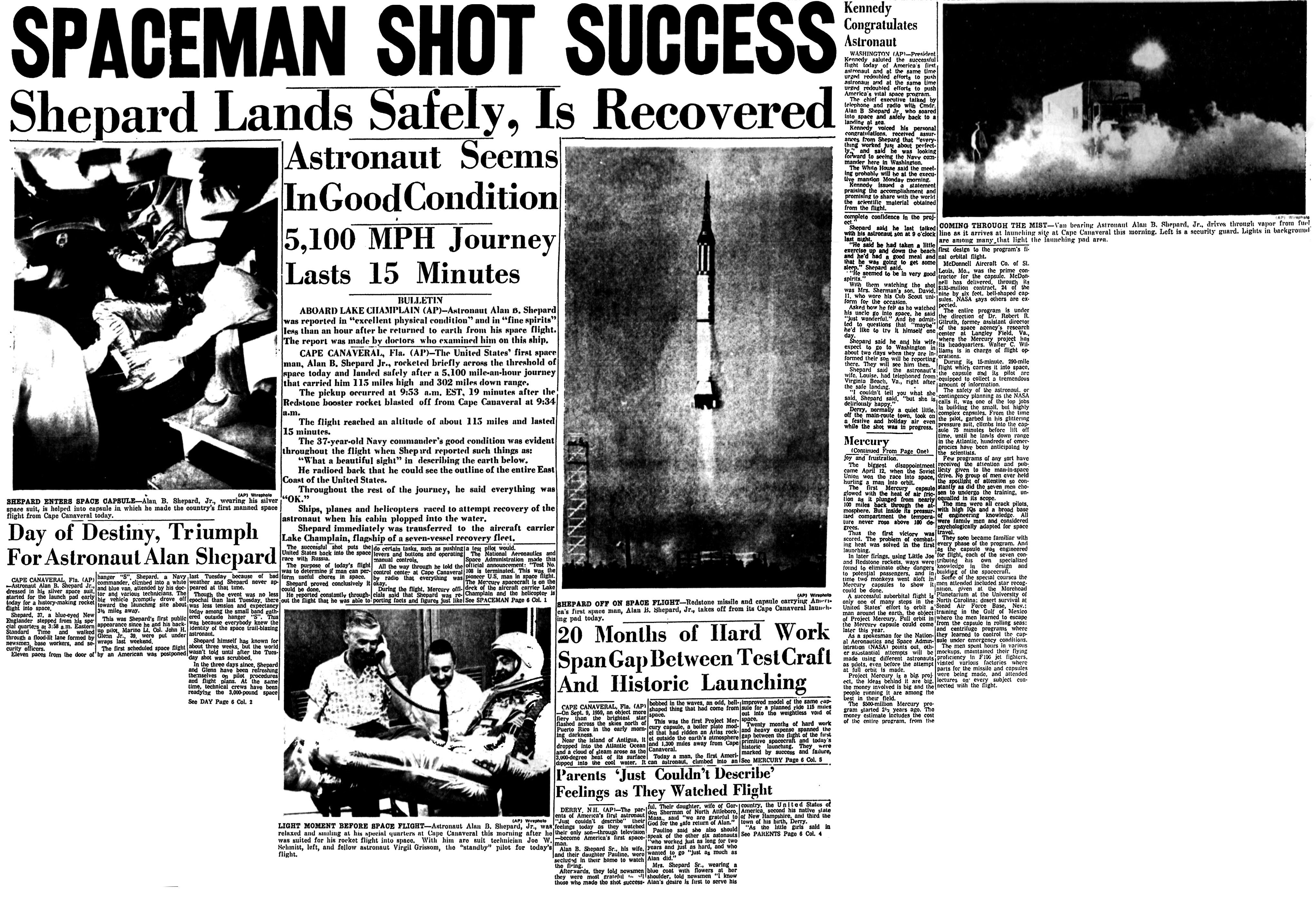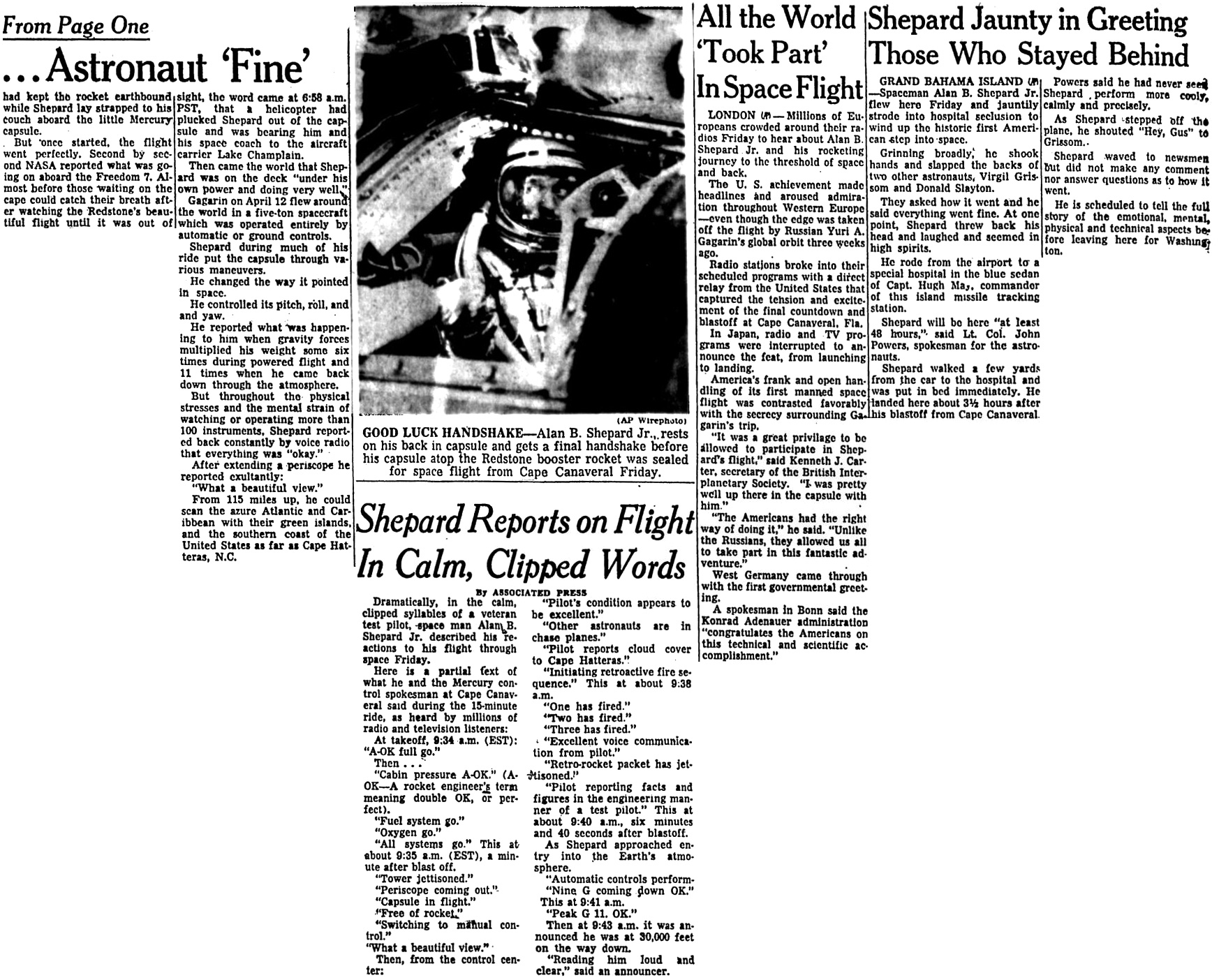 «Согласно информации, полученной с мыса Канаверал, была запущена ракета с человеком на борту. Через 15 минут, капсула с пилотом, Аланом Шепардом, упала в Атлантический океан на расстоянии 300 миль от мыса Канаверал».