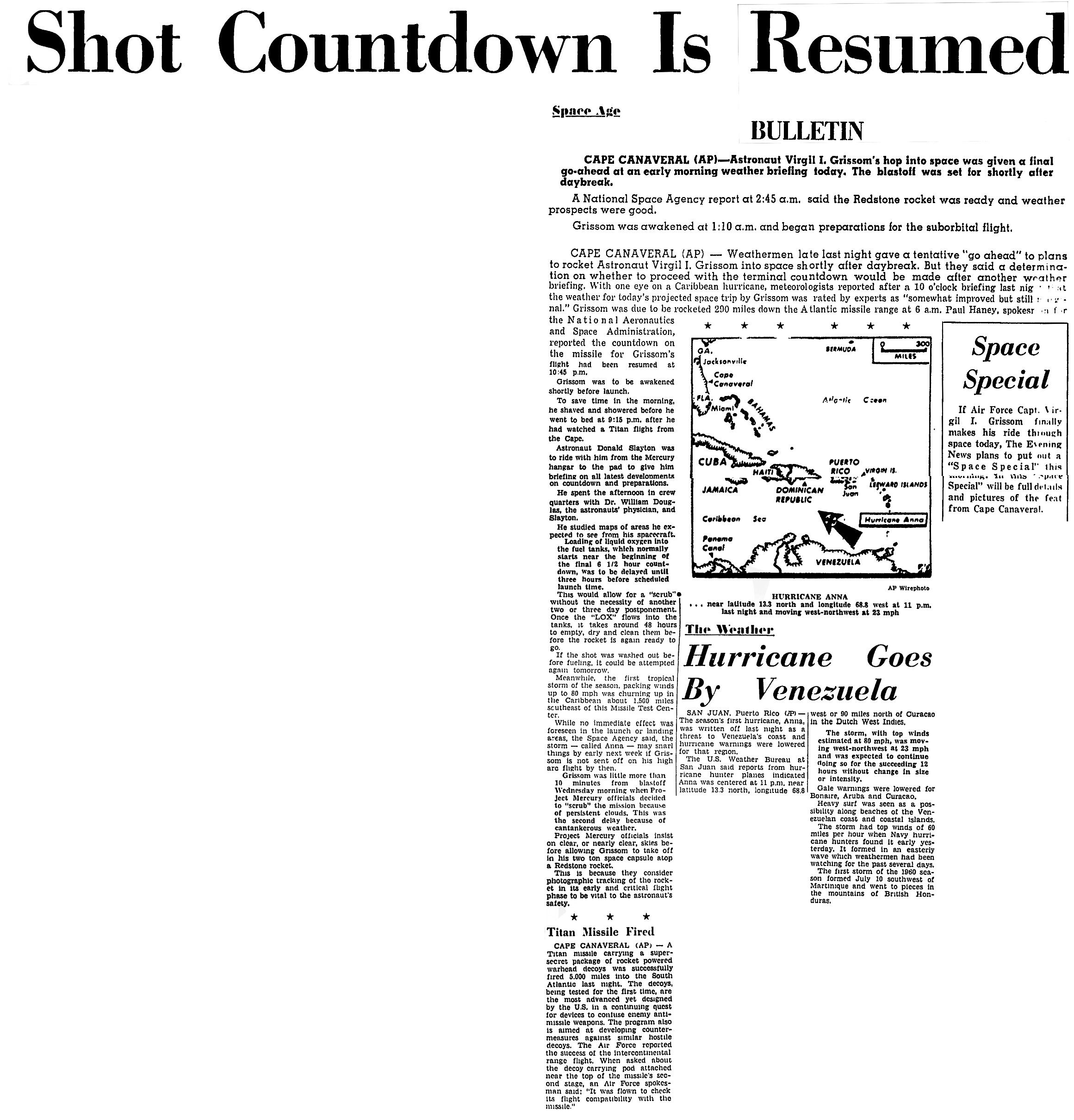 «Ивнинг Таймс» планирует выйти сегодня утром со специальным космическим выпуском, если будет совершен космический полет капитана ВВС Вирджила А. Гриссома. Этот «Специальный космический» представит все подробности и фотографии с мыса Канаверал.