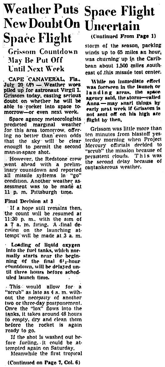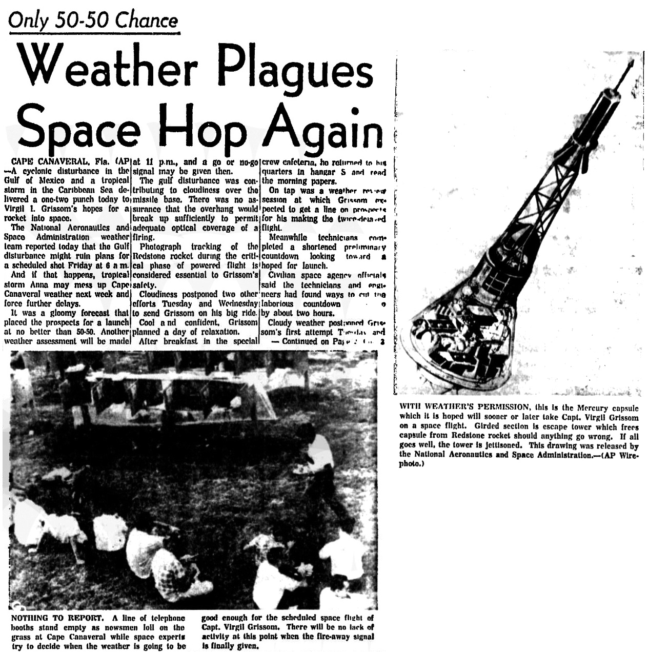 Мыс Канаверал, штат Флорида. Астронавт Гриссом провел четыре часа наверху ракеты «Редстоун», ожидая своего полета в космос. Но второй раз подряд погода вынудила отменить запуск и запуск был перенесен на сегодня (на пятницу).