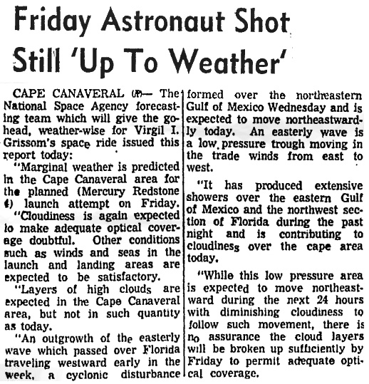 Мыс Канаверал. Команда метеорологов Национального космического агентства, которая даст разрешение на космический полет Вирджила А. Гриссома, опубликовала сегодня следующий отчет: