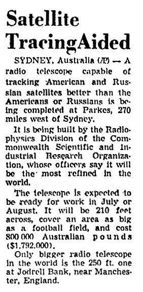 Сидней, Австралия. Строительство радиотелескопа, способного вести слежение за американскими и советскими спутниками лучше, чем это делают американцы и Советы, завершается в Парксе, 270 миль к западу от Сиднея.
