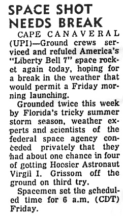 Дважды остановленные на этой неделе из-за капризного сезона летних штормов Флориды, метеорологи и эксперты федерального космического агентства признались в частном порядке, что у них имеется примерно один шанс из четырех на запуск с третьей попытки астронавта Вирджила А. Гриссома, уроженца штата Индиана.