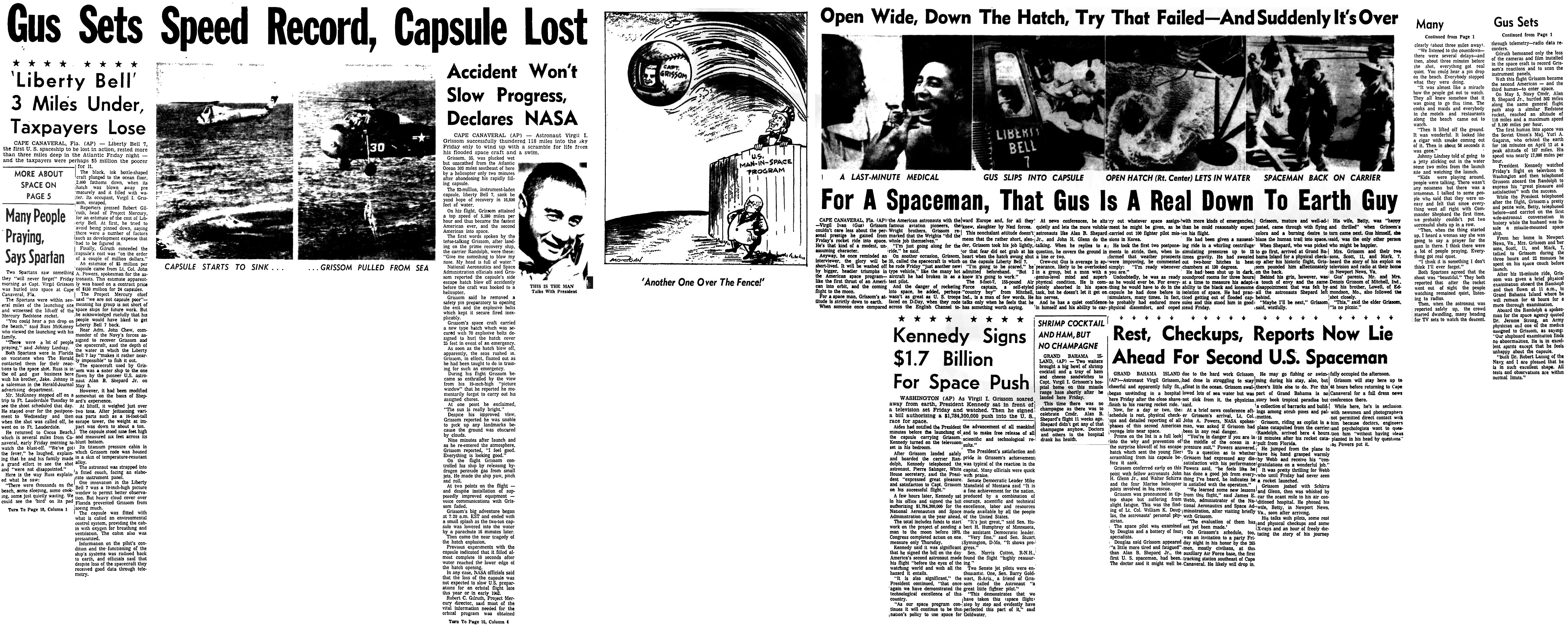 Невосполнимая утрата космический капсулы капитана Вирджила Гриссома лишь слегка омрачает счастливую историю второго пилотируемого суборбитального ракетного полета Америки.