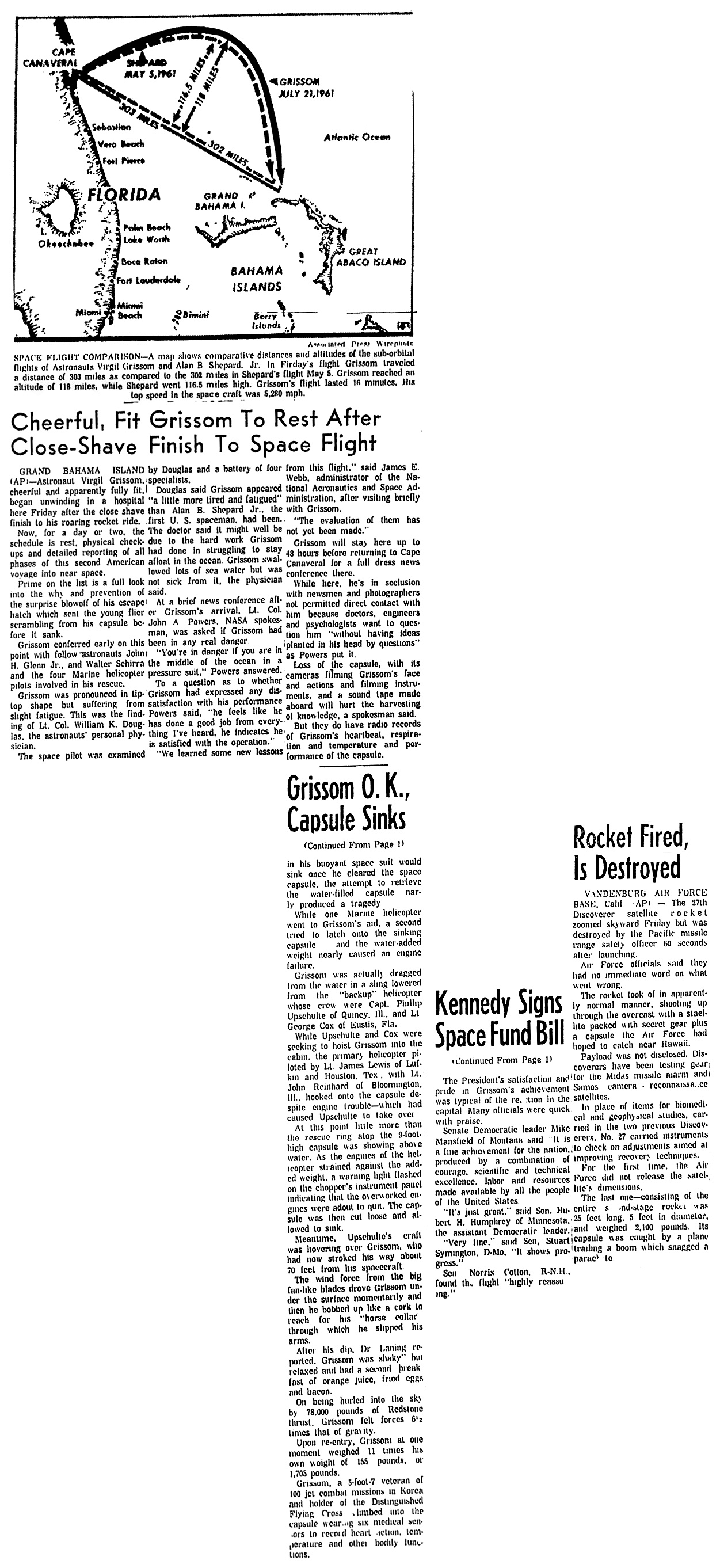 Карта показывает сравнительные расстояния и высоты суборбитальных полетов астронавта Вирджила Гриссома и Алана Б. Шепарда-младшего. Во вчерашнем полете Гриссом преодолел расстояние в 303 мили, а Шепард — 302 мили в полете от 5 мая. Гриссом достиг высоты в 118 миль, в то время, как Шепард поднялся на высоту в 116.5 миль. Полет Гриссома продлился 16 минут. Его максимальная скорость в космическом аппарате составила 5'280 миль в час.